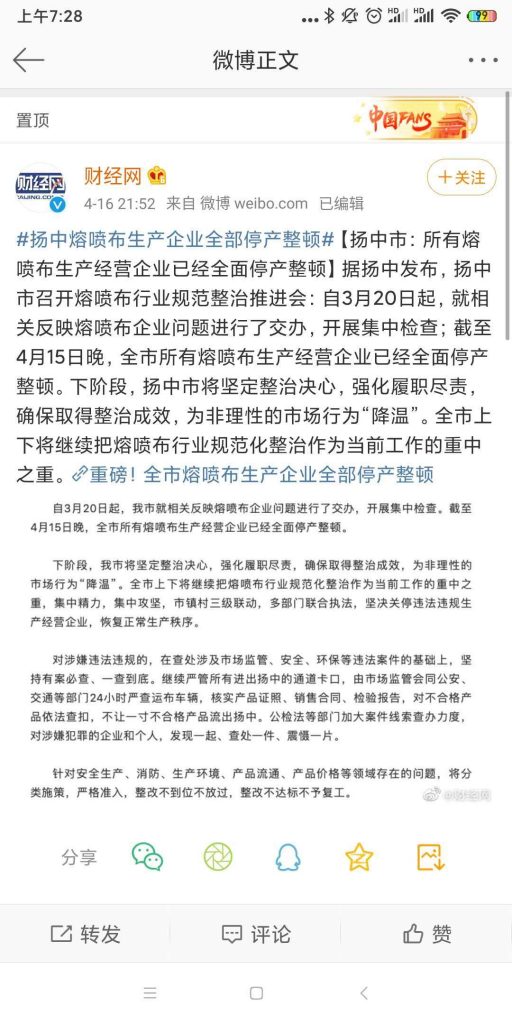 真正讓熔噴布大幅降價(jià),扭轉(zhuǎn)熔噴布地下小作坊的亂象,還是需要市場(chǎng)的力量,比如中石油、中石化等國(guó)企大廠開始大量出貨。沒有了暴利誘惑,小作坊的生產(chǎn)自然停息。