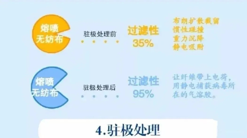 熔噴無(wú)紡布本身的過(guò)濾性能其實(shí)只有70%以下的,純粹靠熔噴超細(xì)纖維的纖維細(xì)、空隙小、孔隙率高的纖維三維集合體的機(jī)械阻擋作用是不夠的。不然,一味增加材料克重厚度反而會(huì)大大增加過(guò)濾阻力。所以熔噴過(guò)濾材料普遍都是會(huì)通過(guò)靜電駐極的工藝對(duì)熔噴布進(jìn)行添加靜電電荷效應(yīng),利用靜電的方法提升過(guò)濾效率,可以達(dá)到99.9%到99.99%。也就是達(dá)到N95標(biāo)準(zhǔn)或以上。
