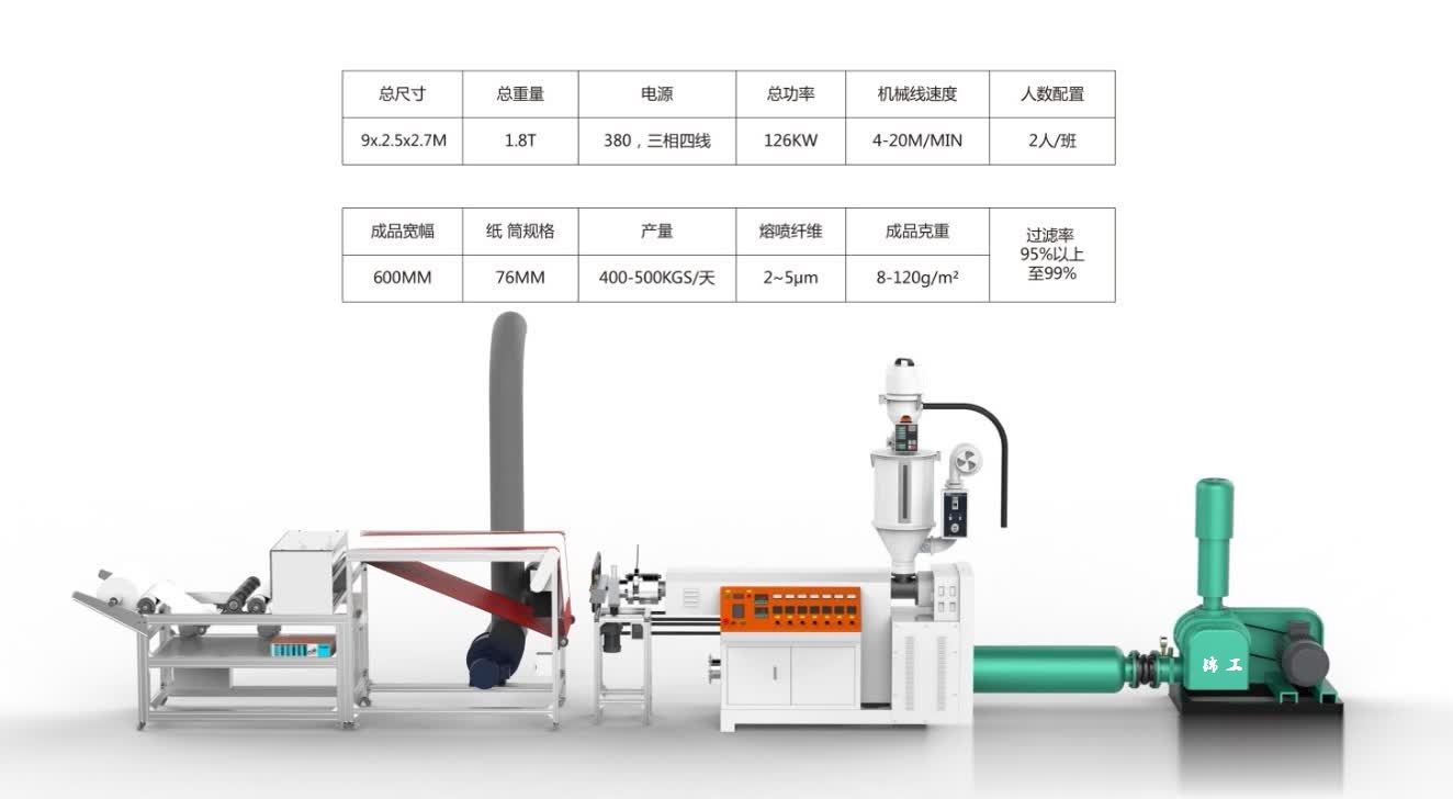 目前市場上面的設備大小生產線比較多,從300到3200mm寬幅都有,配置也是有很大的區別,熔噴布設備主要核心部件在于: ?羅茨鼓風機,空氣加熱器,自動吸料烘干機,單螺桿擠出機,過濾器,熔體計量泵,噴絲模頭,接布臺,靜電駐極機,切布及卷布。