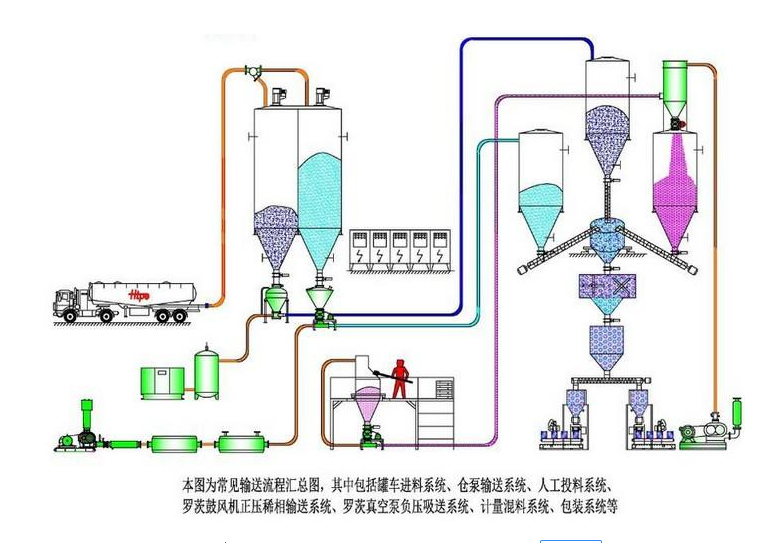 混合系統(tǒng)結(jié)合了正、負(fù)壓系統(tǒng)各自的優(yōu)點(diǎn),在該系統(tǒng)中,負(fù)壓部分把物料從多個(gè)喂料倉中吸走,而正壓部分把物料送入多個(gè)卸料倉。氣源靠一臺(tái)通風(fēng)機(jī)或鼓風(fēng)機(jī)提供。