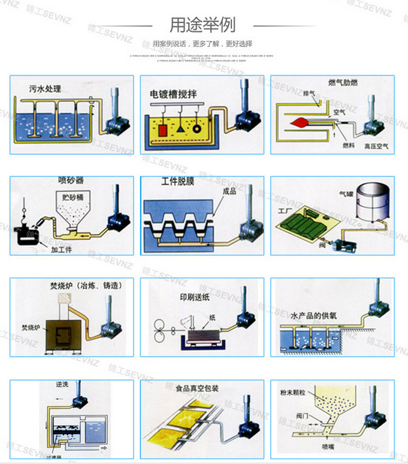 水產養殖: 大規模魚蝦養殖場,利用羅茨鼓風機向養殖池中鼓入空氣,增加水中氧的溶解含量,加快某些有害物質的氧化分解,促使水質凈化,促進魚蝦生長; 類似裝置還用于水族館和活魚槽的供氧和攪拌。對育蝦苗水體積每分鐘的送氣量應達到總水體積分數的1.5%以上。壓力的選取應依據:①水深;②輸氣管長度和粗細;③氣泡的局部損失。一般情況:1m水深時升壓為l9.6kPa;;1~ 1.5m 水深時升壓為29.4kPa;1.5m以上時升壓為39.2kPa或更高。