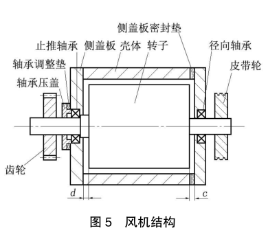 用塞尺法檢測(cè)轉(zhuǎn)子端面與機(jī)殼的軸向間隙。定位端( 齒輪側(cè))間隙d=0.1~0.2 mm,非定位端( 皮帶輪側(cè))間隙c=0.3~0.5 mm,總間隙的標(biāo)準(zhǔn)是 0.4~0.7mm。